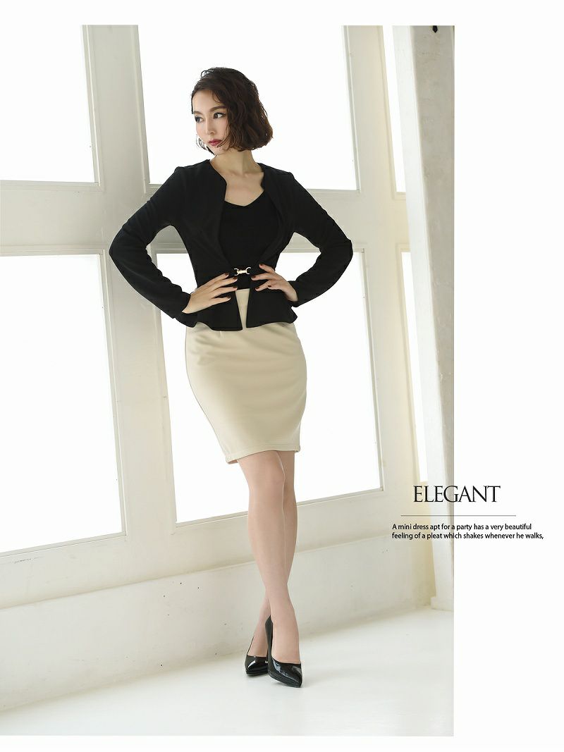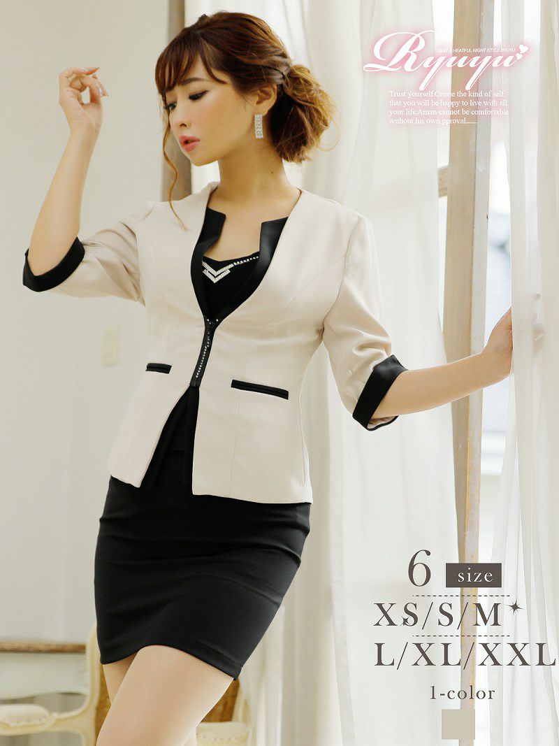 センターのジップデザインが珍しい❗お顔周りをスッキリ見せるノーカラージャケットとセクシーな黒のタイトスカートがセットになったキャバスーツです😊✨